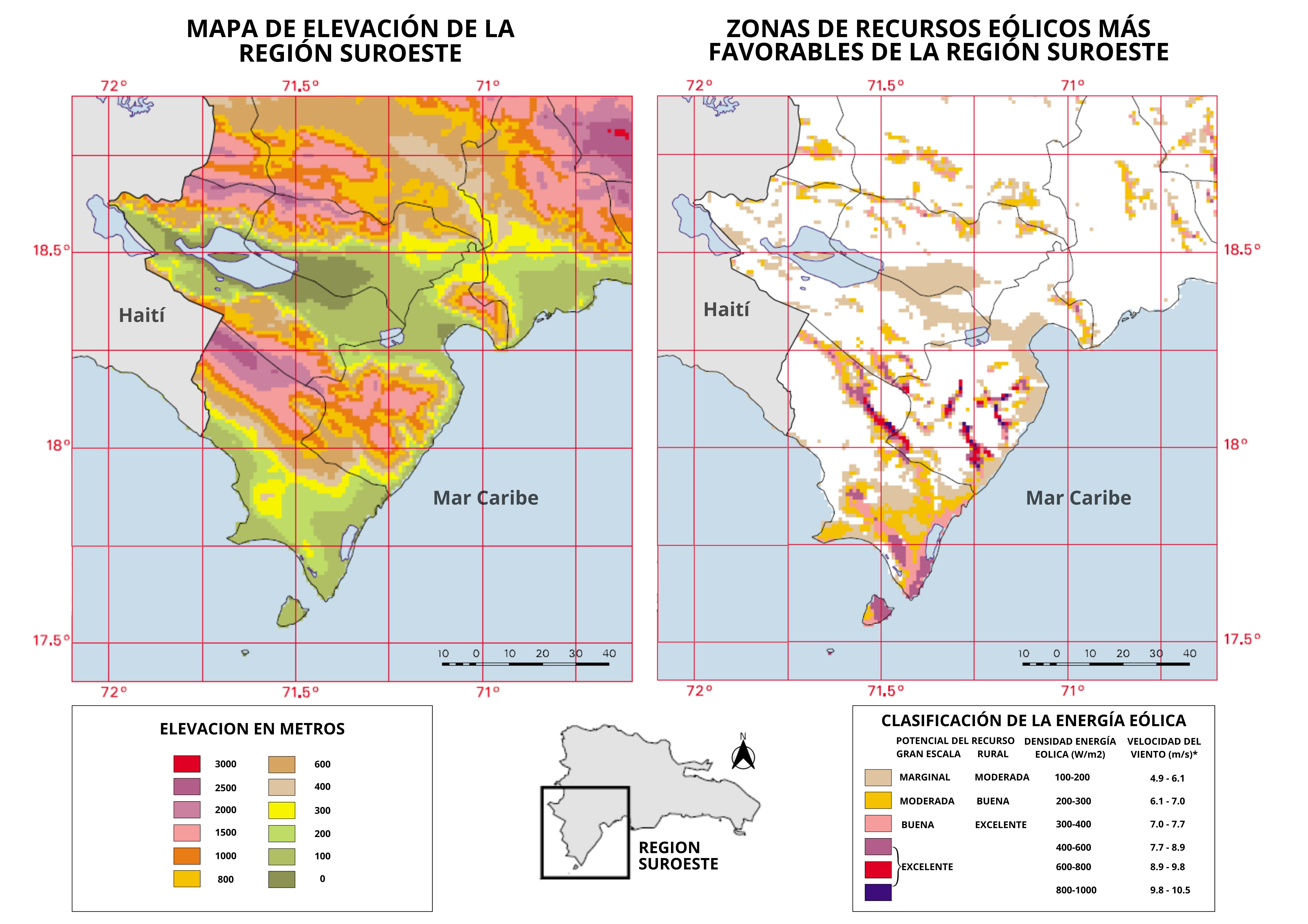 Figura 2 - Mapa de Elevación (izquierda) y zonas de recursos eólicos más favorables de la Región Suroeste (derecha). Fuente: Adaptado de Elliott, D. et al. (2001). Wind energy resource atlas of the Dominican Republic. Golden, CO (United States): National Renewable Energy Lab (NREL), U.S. Department of Energy.