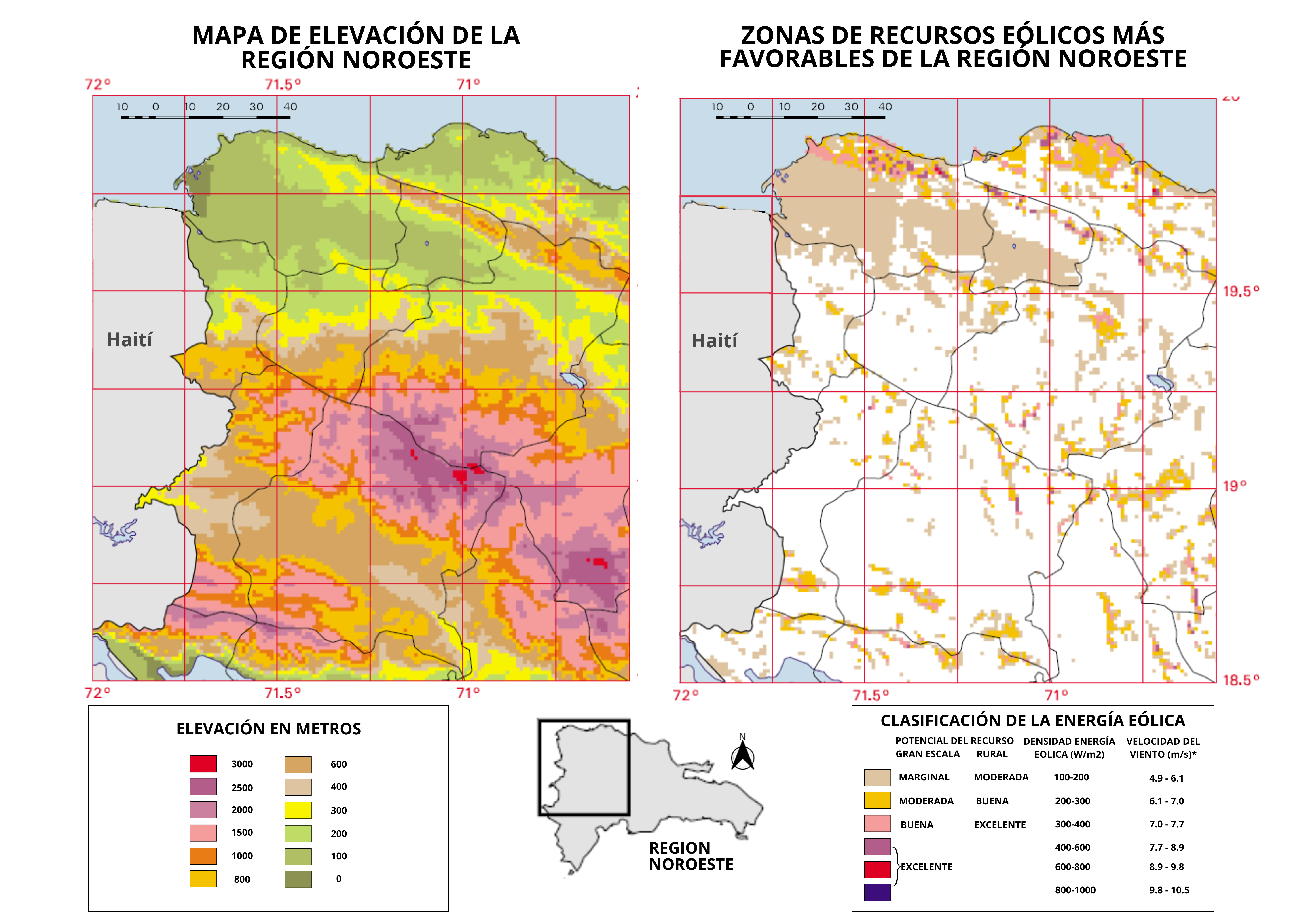 Figura 3 - Mapa de Elevación (izquierda) y zonas de recursos eólicos más favorables de la Región Noroeste (derecha). Fuente: Adaptado de Elliott, D. et al. (2001). Wind energy resource atlas of the Dominican Republic. Golden, CO (United States): National Renewable Energy Lab (NREL), U.S. Department of Energy.