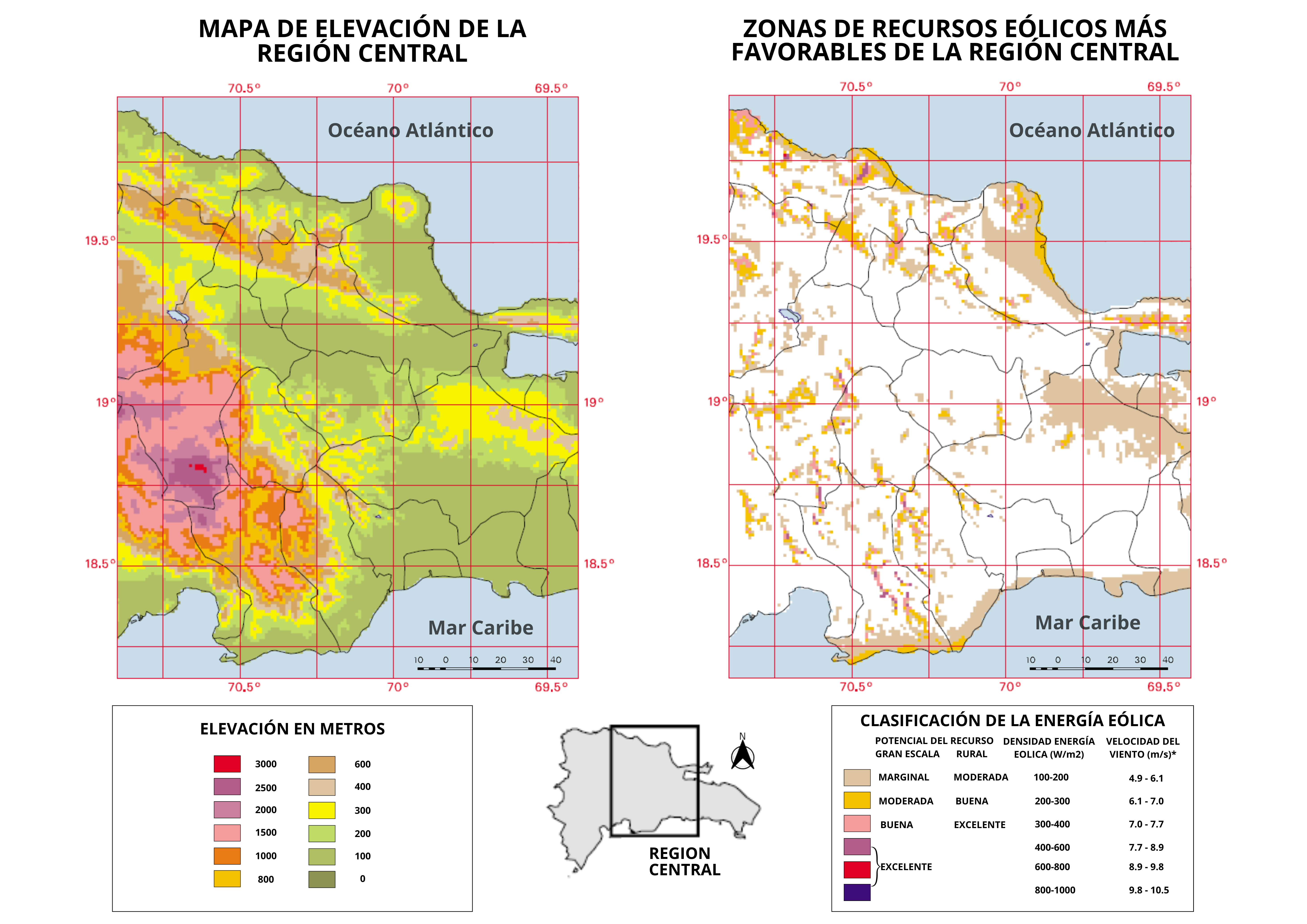 Figura 4 - Mapa de elevación (izquierda) y zonas de recursos eólicos más favorables de la Región Central (derecha). Fuente: Adaptado de Elliott, D. et al. (2001). Wind energy resource atlas of the Dominican Republic. Golden, CO (United States): National Renewable Energy Lab (NREL), U.S. Department of Energy.