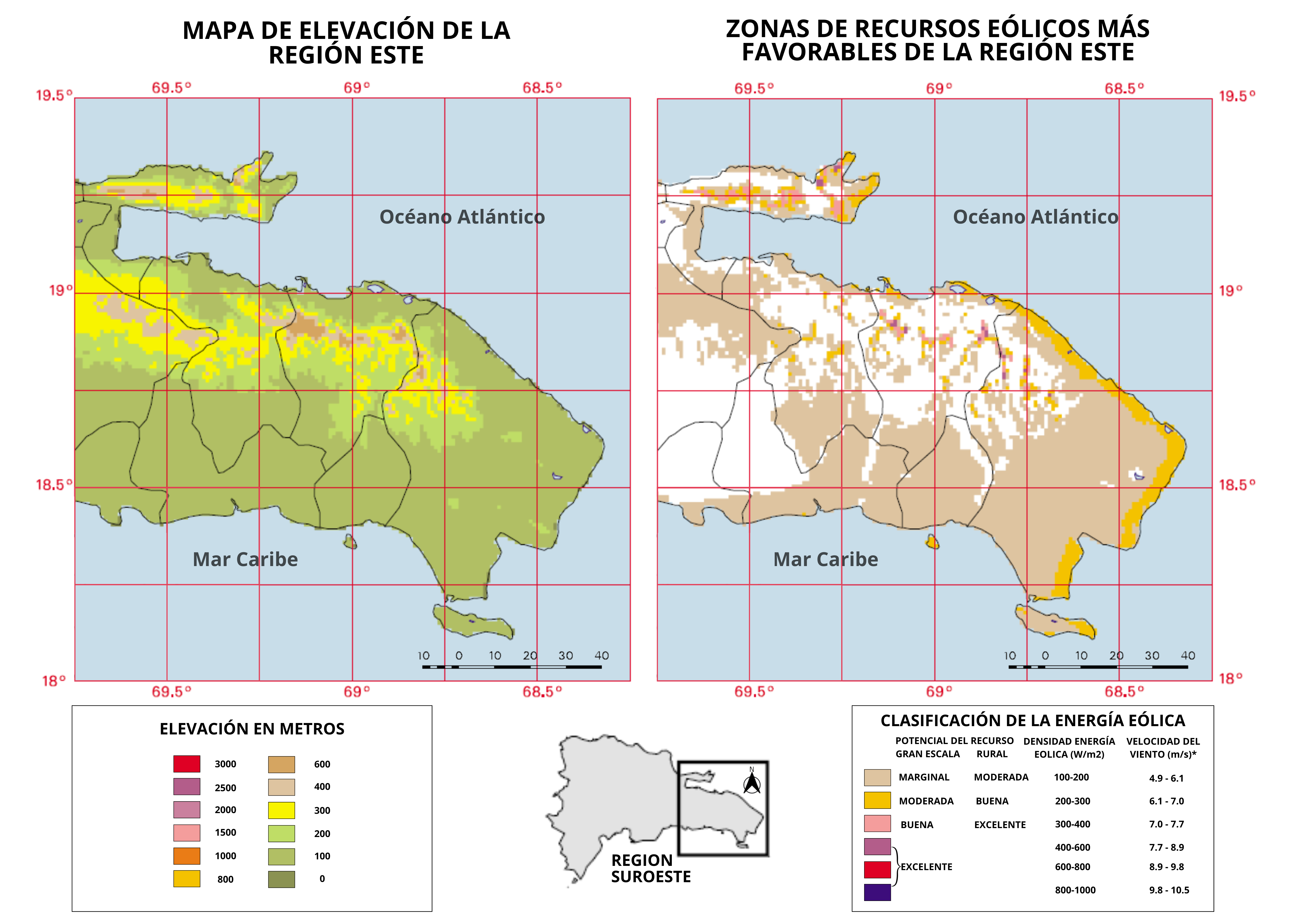 Figura 5- Mapa de elevación (izquierda) y zonas de recursos eólicos más favorables de la Región este (derecha). Fuente: Adaptado de Elliott, D. et al. (2001). Wind energy resource atlas of the Dominican Republic. Golden, CO (United States): National Renewable Energy Lab (NREL), U.S. Department of Energy.