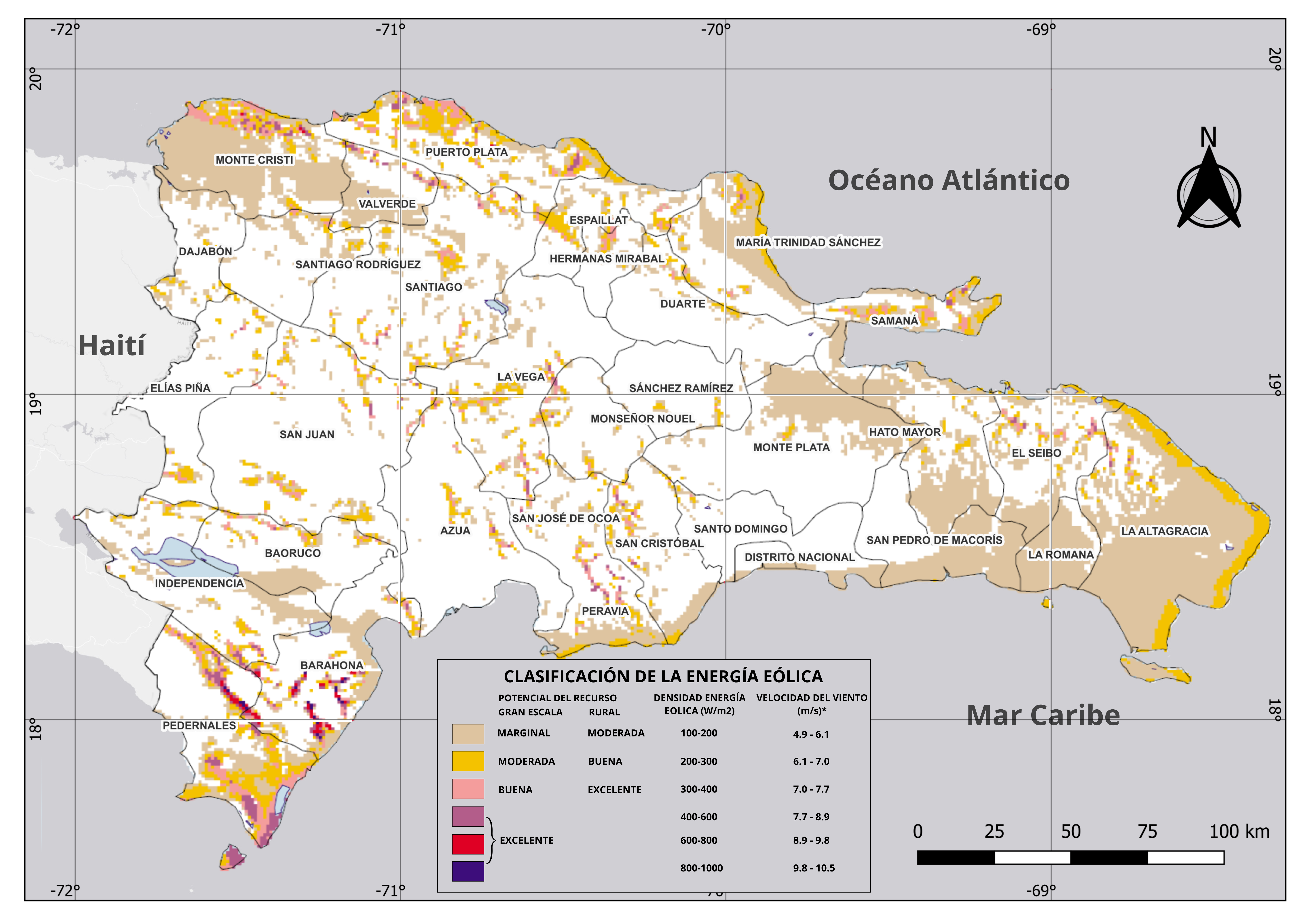 El Atlas de Recurso Eólico de la República Dominicana (2001), publicado por el National Renewable Energy Laboratory (NREL) constituyó el primer estudio integral del país dedicado a caracterizar la distribución y la calidad del viento con fines energéticos. Este documento marcó un antes y un después, pues combinó sistemas de información geográfica (GIS), datos meteorológicos de superficie y perfiles atmosféricos para generar los primeros mapas de alta resolución (1 kilómetro cuadrado [km2]) del potencial eólico nacional. El resultado principal fue un mapa de potencia eólica codificado por colores, expresado en unidades de W/m² y acompañado de la velocidad media equivalente del viento para cada celda de la cuadrícula (ver figura 1)[1].